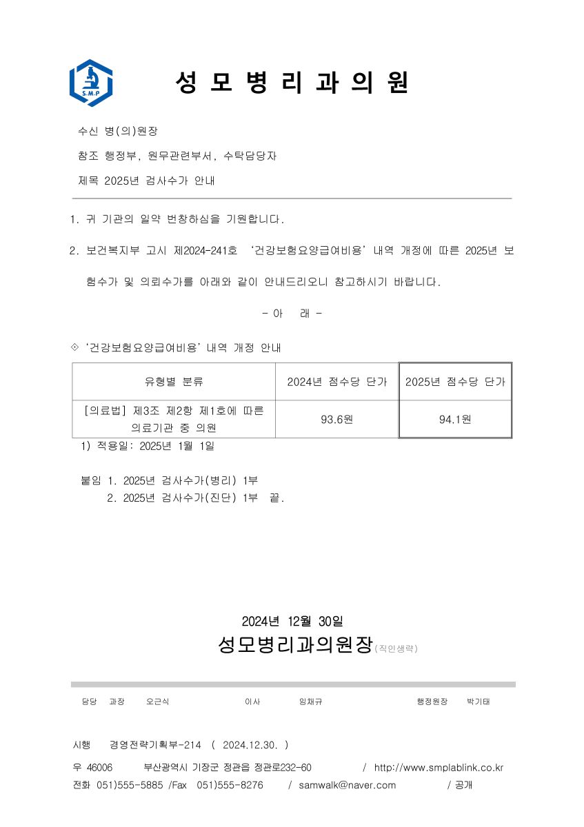 성모병리과의원 2025년 검사수가 안내 공지입니다.