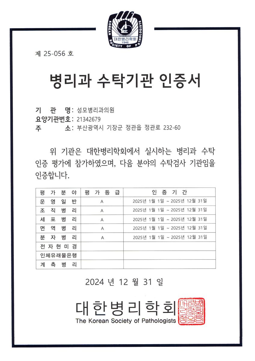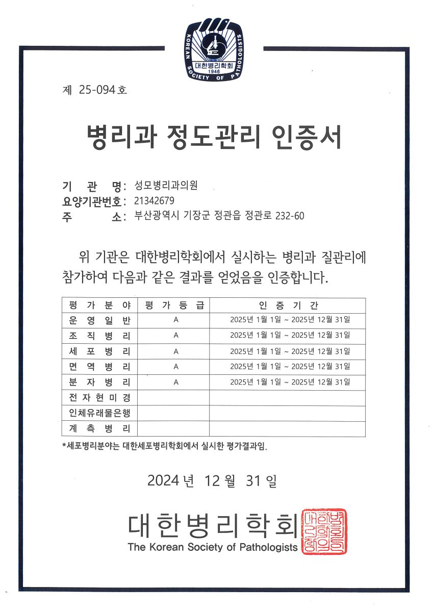 성모병리과의원 2025년 병리과인증현황입니다.