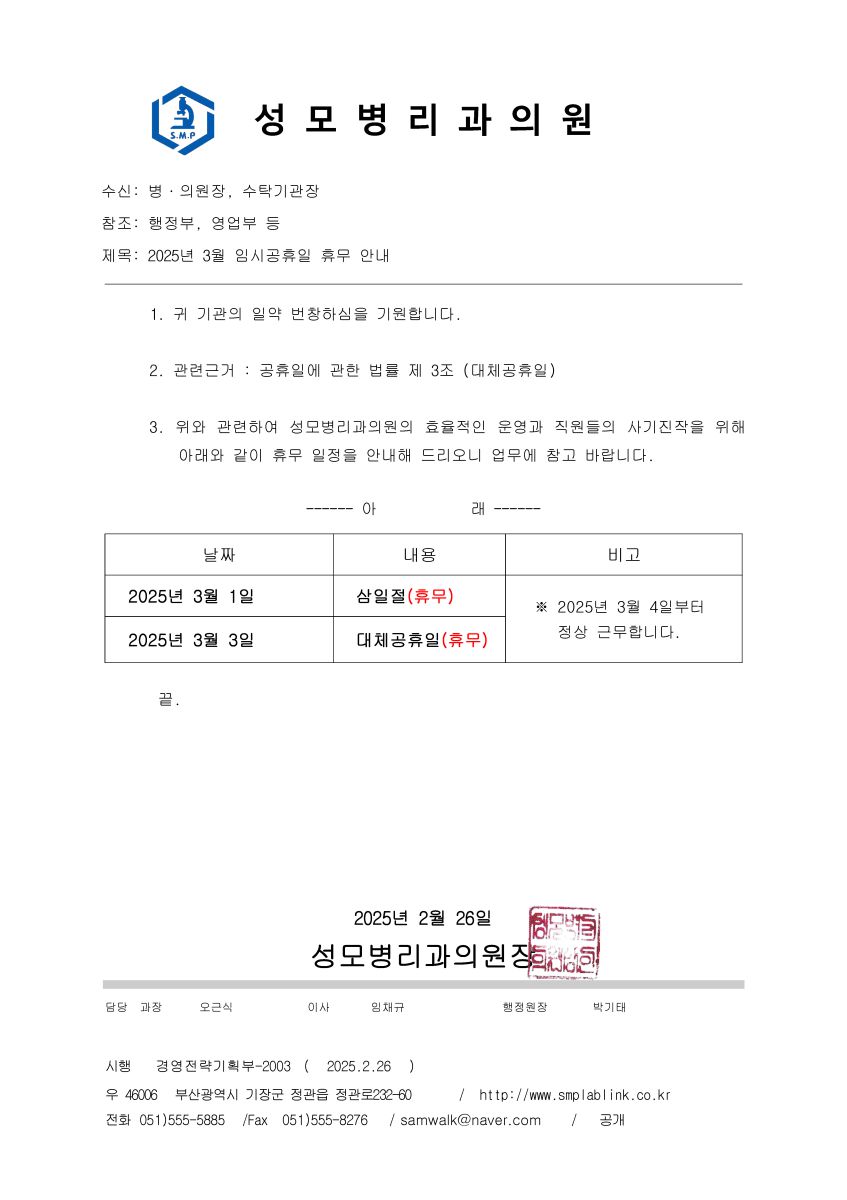 성모병리과의원 2025년 3월 임시공휴일 휴무안내입니다.