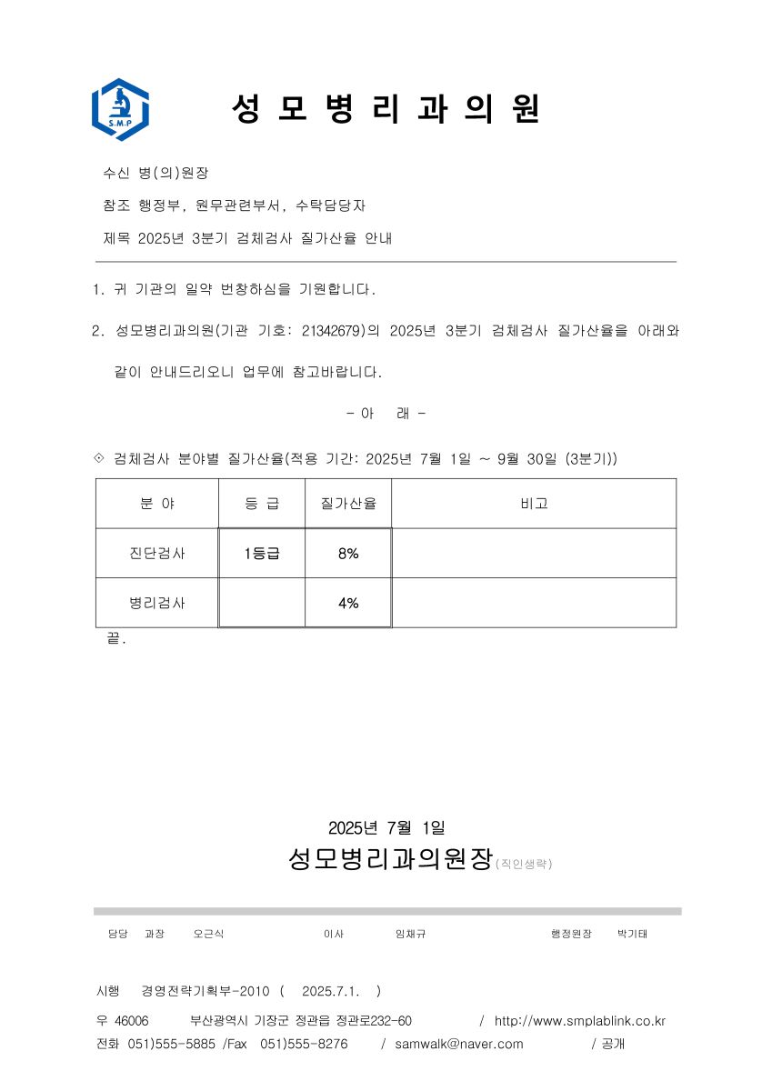 성모병리과의원 2025년 3분기 검체검사 질가산율 안내해드립니다.