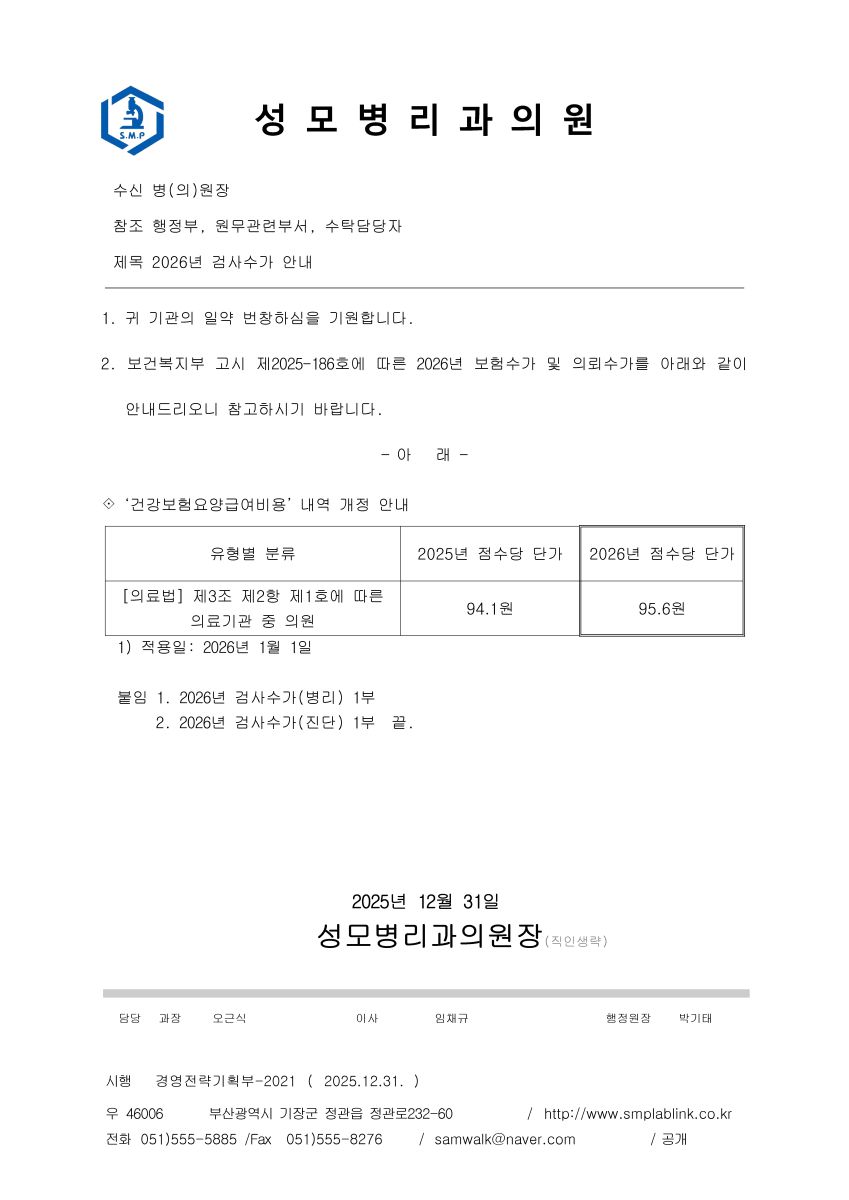 성모병리과의원 2026년 검사수가 안내 공지입니다.
